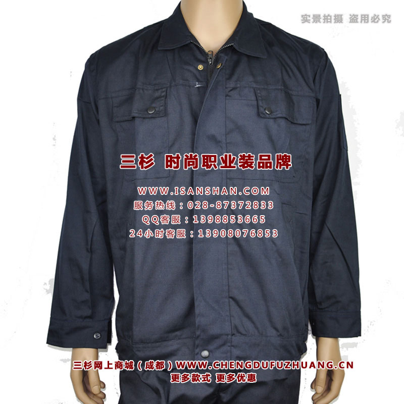 成都长袖工作服特价,夏季深蓝色短袖 工作服线绢棉、耐穿、纽扣式
